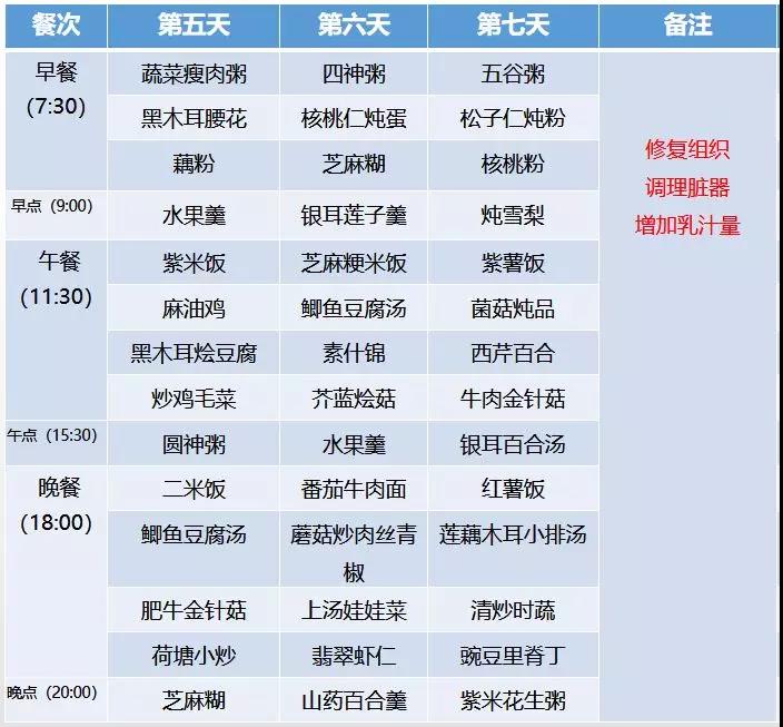 ● 产后第一阶段月子餐(出院后1-7天)