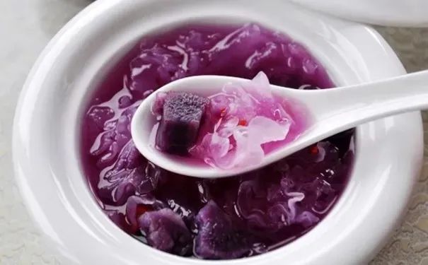 做法:小米半小碗、银耳4~5朵、紫薯1~2个、蜂蜜适量;这道粥加入了紫薯和银耳,不仅具有滋阴润燥的功效,而且紫薯的加入,让粥的色泽更加充满食欲,同时,具有润肠通便和降压功效。