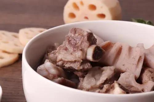 (6)把莲藕、排骨及汤汁一起倒进砂锅,再炖30分钟,拣出生姜、香葱不用,放精盐、胡椒、味精即可。