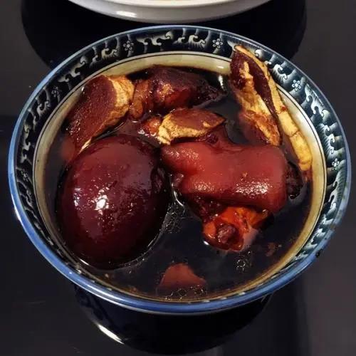 (7)加入猪脚、鸡蛋、红糖,大火煮开转中小火继续1小时,熄火。