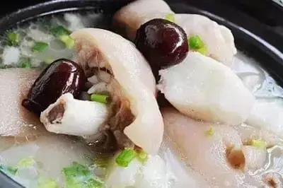 3、将油倒入锅中,放入姜片、猪脚块,爆炒顷刻,参加清汤、大红枣、花生米、葱段,用中火煮至汤色变白,加盐调味即可。