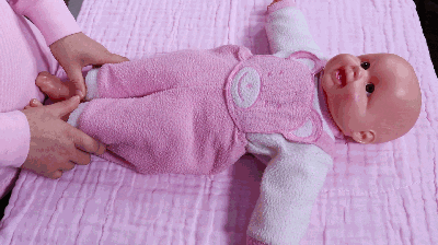 动作3:家长握住宝宝脚踝、小腿,让宝宝像蹬自行车一样,两腿交替压向腹部,左右交替各做8次;