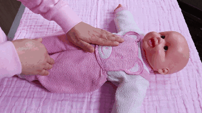 动作1:小宝宝平躺,用手指或手掌以宝宝肚脐为中心,顺时针按摩宝宝的小肚子,注意力度,不要压迫到胃部,以免引起吐奶。按摩时间1-5分钟。