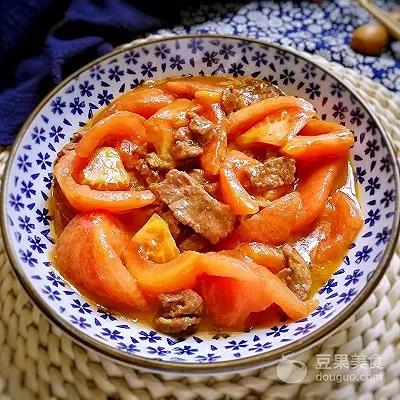 西红柿出水时,加入牛肉略炒,炒匀以后盛盘即可。