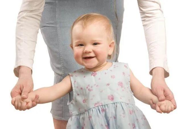 在扶宝宝学走时,先用双手,然后用单手领着走。