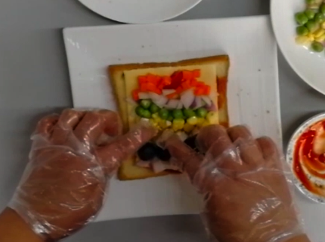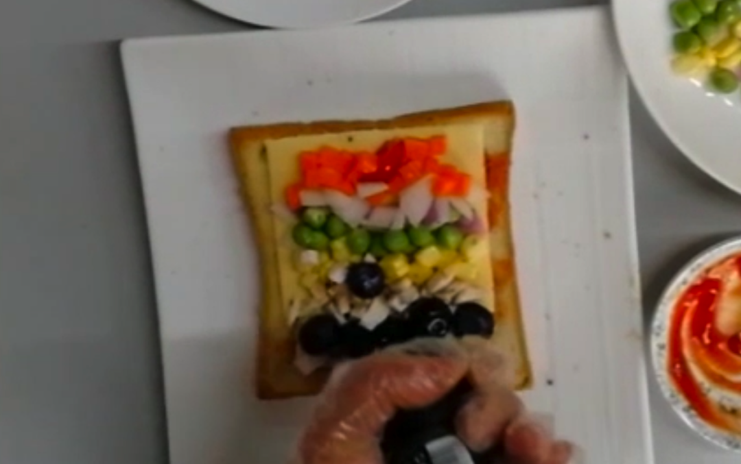 准备两片吐司面包,两片奶酪,适量的番茄酱、黑胡椒碎。另外准备一些果蔬丁,如:蘑菇丁、洋葱丁、番茄丁、玉米粒、青豆粒、蓝莓等等。