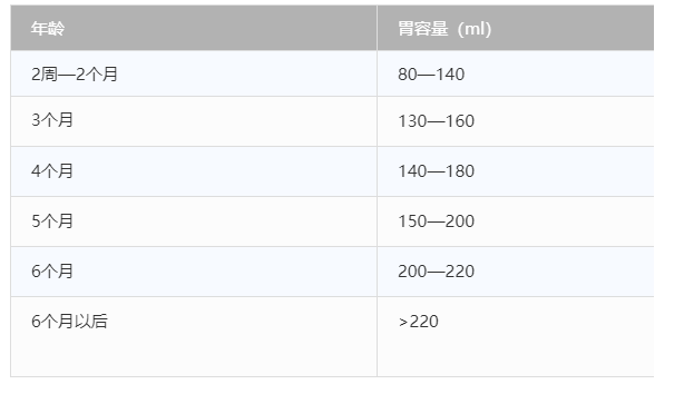 婴儿的生理胃容量很小,且随着月龄而不断增长,出生时不足10ml;4天后为40~50ml;10天后为80ml,以后每月增加25ml: