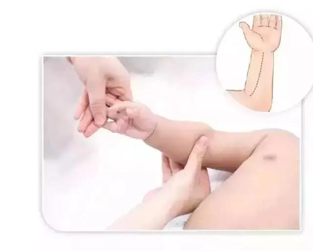操作方法:后用拇指蘸取少量冰水,推天河水50次。天河水即从宝宝手腕横纹至肘部横纹处。