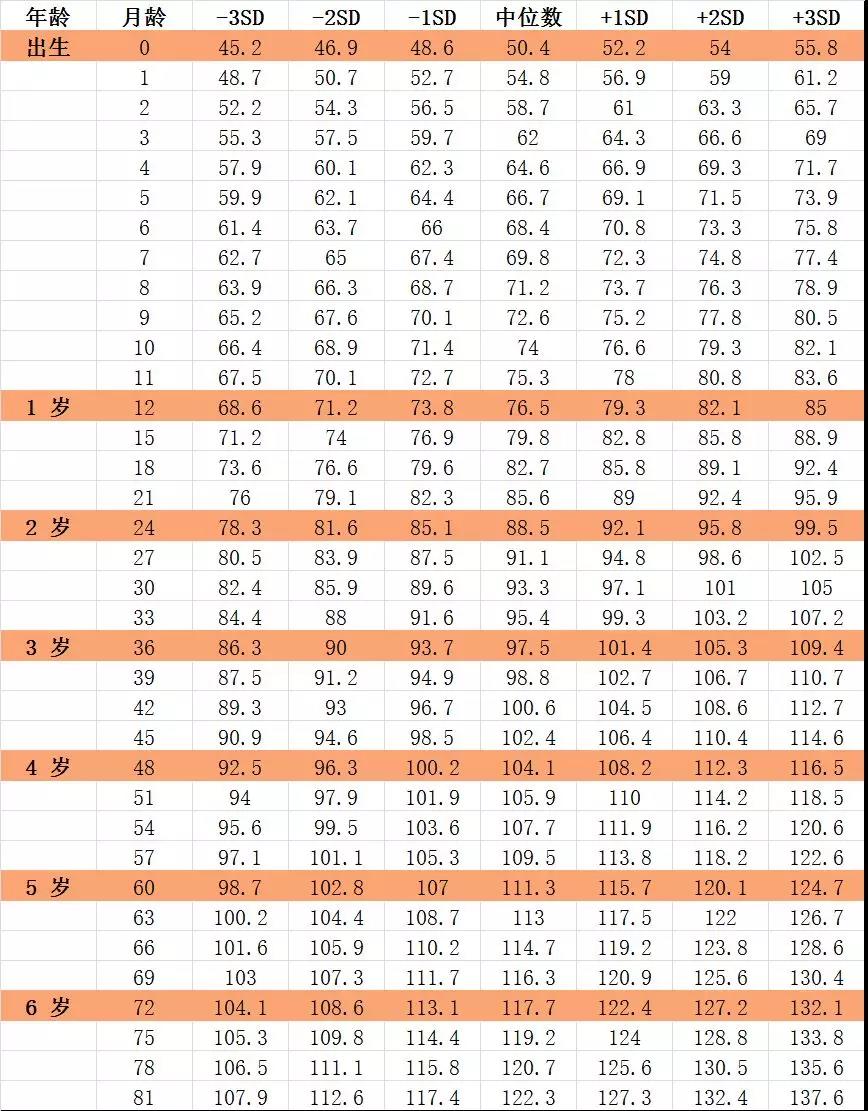 首先在左边第一列和第二列找到宝宝的年龄,然后横向看宝宝的身高处在哪个区间。