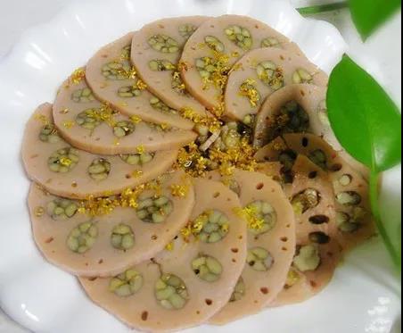 取一根莲藕,洗干净后用泡好的绿豆灌满,放入锅中后加入适量水,煮至藕和绿豆变软,即可捞出,切片食用,也可以淋上蜂蜜或糖桂花。