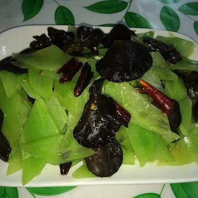 食材:青笋500克,木耳150克,彩椒20克,姜15克,油盐糖各适量,生粉适量。