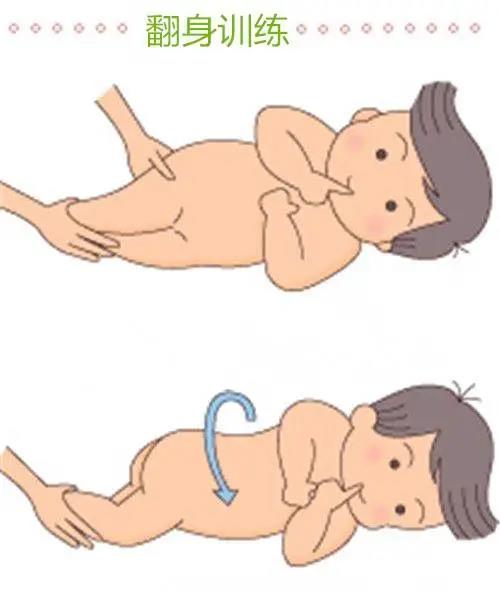 训练宝宝翻身,可将宝宝放置于硬板床上,取仰卧位,衣服不要太厚,把宝宝左腿放在右腿上,大人的左手握宝宝左手,宝宝产生翻身动作。