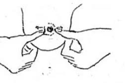 b、两大拇指放在乳头左右两侧,慢慢向外拉;