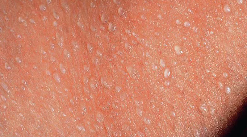 痱子,大多是带尖的小红疹,由若干个栗粒状的小包包组成一片↓↓↓