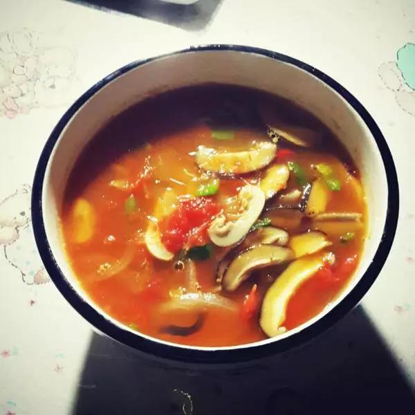 热锅,加入适量油然后加入番茄块翻炒,多炒一会儿等番茄出红汁以后,加入香菇翻炒,然后加入适量水;